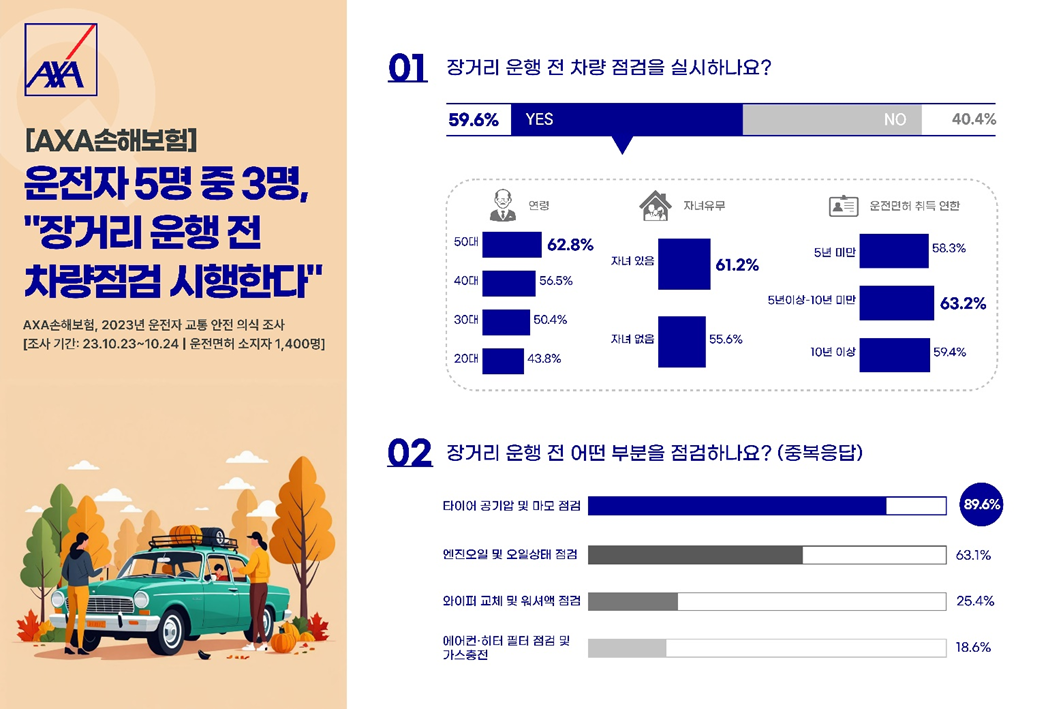 AXA손해보험(이하 악사손보)에서는 명절 연휴 등 장거리 이동 전 차량 점검의 필요성을 고려하여 관련 실태 파악을 위한 ‘운전자 교통 안전 의식 조사’를 진행한 바 있다. 악사손보가 지난해 만 19세 이상 운전면허 소지자 1,400명을 대상으로 실시한 ‘2023 운전자 교통 안전 의식 조사’ 결과에 따르면, 전체 응답자 5명 중 3명(59.6%)은 장거리 운행 전 차량 점검을 착실히 시행 중인 것으로 나타났다.