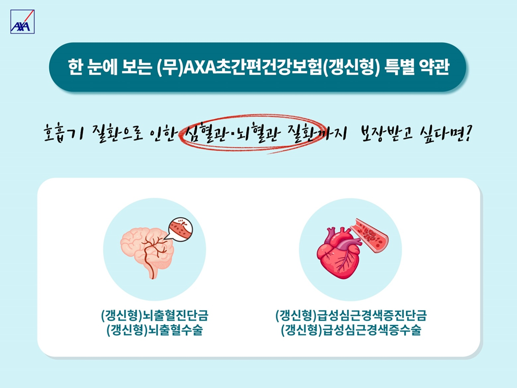 AXA손해보험의 ‘(무)AXA초간편건강보험(갱신형)’은 이러한 고객의 필요성을 반영한 상품으로 고령층도 가입할 수 있다. 이 상품은 40세부터 75세까지 가입 가능하며, 심혈관 질환과 뇌혈관 질환을 보장해 독감 등 호흡기 질환으로 발생할 수 있는 합병증을 대비할 수 있도록 설계되어 있다. 가입 시 뇌출혈 및 급성심근경색 관련 보장을 선택하면 진단금은 최초 1회에 한하여 보장하고, 해당 치료를 목적으로 수술을 받을 경우 매 수술마다 보장받을 수 있다. 또한, ‘(무)AXA초간편건강보험(갱신형)’은 기본 보장으로 일반상해 80% 이상 후유장해를 보장하며, 특약 가입으로 암 진단비, 수술비, 항암방사선·약물치료비 뿐만 아니라 표적항암약물허가치료비까지 보장해 다양한 질병을 종합적으로 대비할 수 있다.