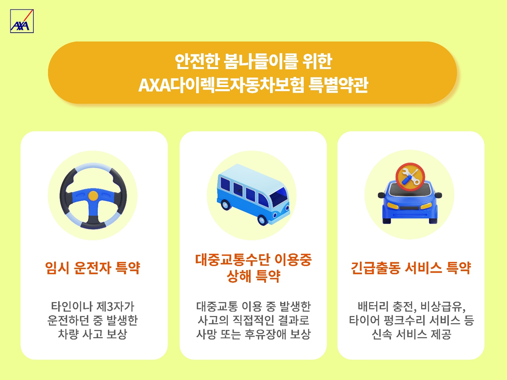 악사손보 관계자는 “봄철 장거리 운전 시 예기치 못한 사고에 대비하려면 교통안전 수칙 준수와 함께, 자동차보험 특약 가입이 실질적인 해결책이 될 수 있다”며, ”악사손보는 합리적인 보험료와 든든한 보장 서비스를 모두 갖춘 자동차보험을 통해, 고객이 언제 어디서나 안심하고 평온한 일상을 누릴 수 있도록 차별화된 보장체계를 지속 강화해 나갈 예정”이라고 전했다.
