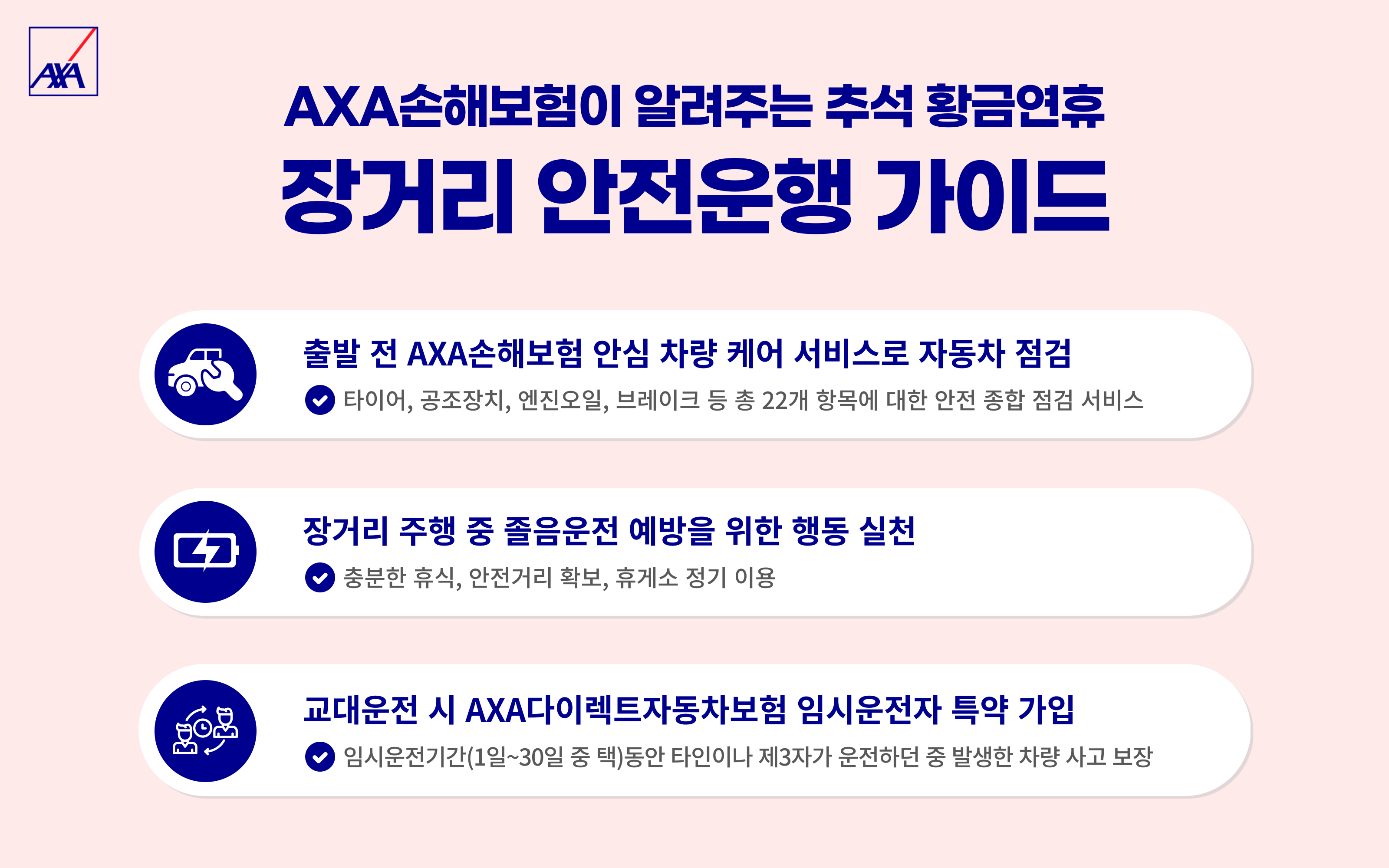 - 10월 추석 황금연휴, 장거리 운전자를 위한 차량 점검 및 자동차보험 점검 필수 - AXA손해보험, 10월 31일까지 ‘안심 차량 케어 서비스’ 운영... 브레이크, 타이어, 공조장치 등 총 22개 항목에 대한 안전 종합 점검 서비스 제공 - AXA다이렉트자동차보험, 임시운전자 특약으로 피보험자 외 운전자 범위 설정 가능해 교대운전 부담 감소
